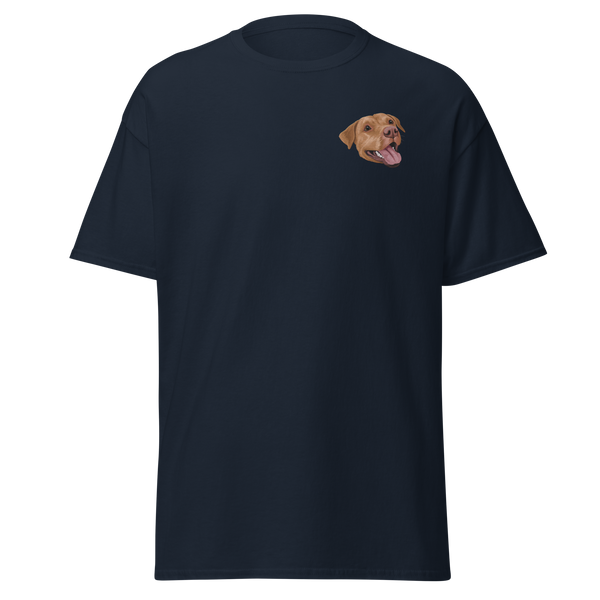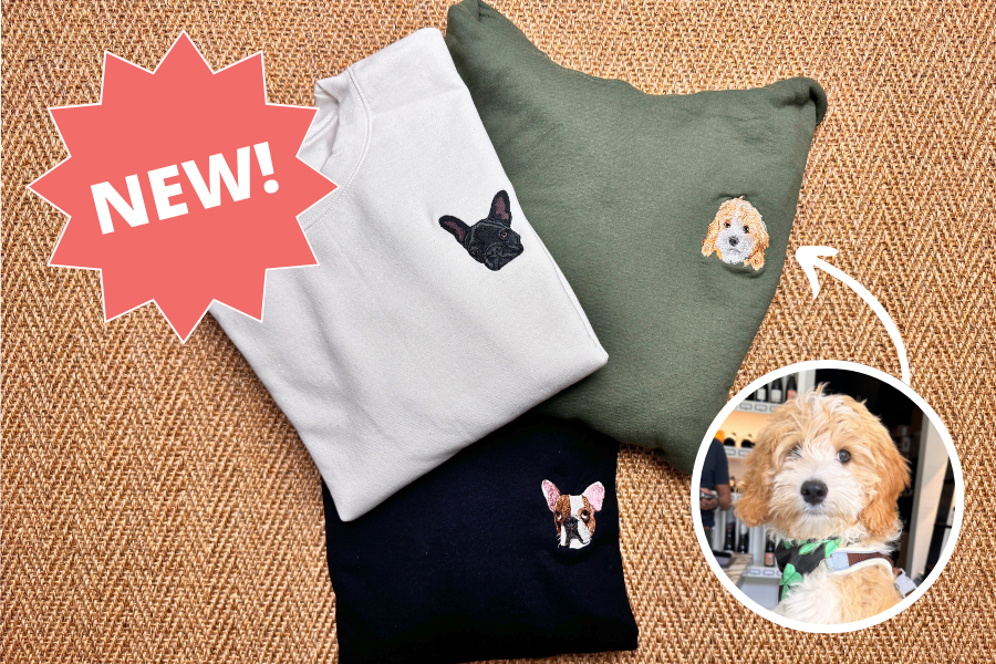 Your pet photo is turned into an illustrated pet portrait, which we then custom-stich onto the apparel item of your choice.